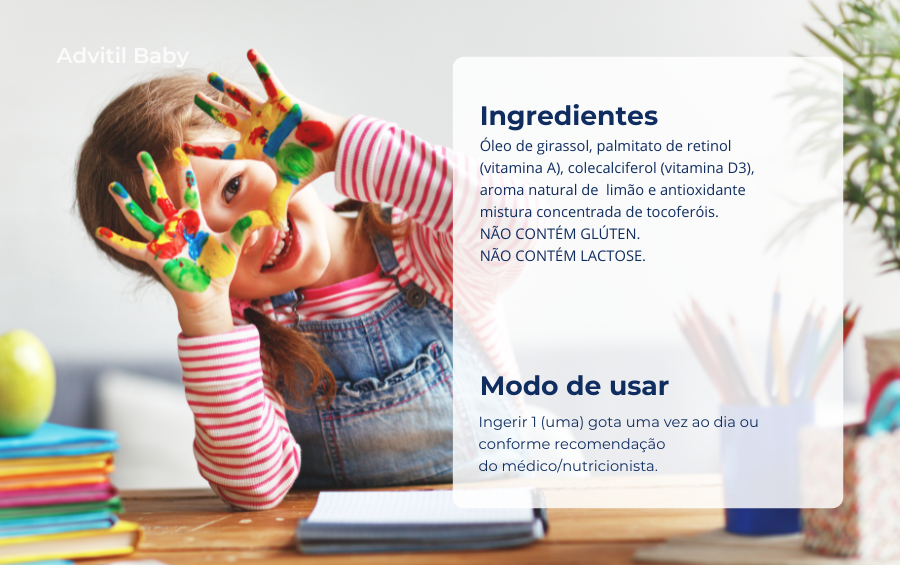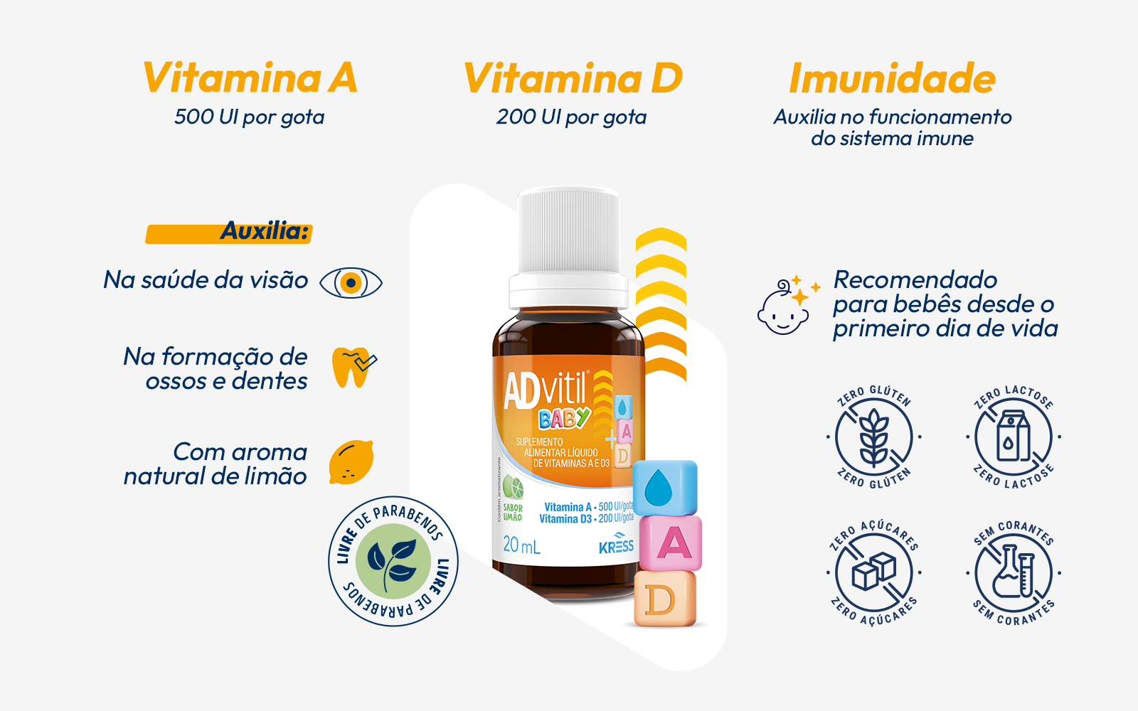 Suplemento formulado especialmente para bebês, com vitaminas A e D essenciais para o desenvolvimento saudável dos pequenos. Essas vitaminas auxiliam no sistema imunológico, na formação de ossos e dentes, além de contribuírem para a saúde da pele e da visão.