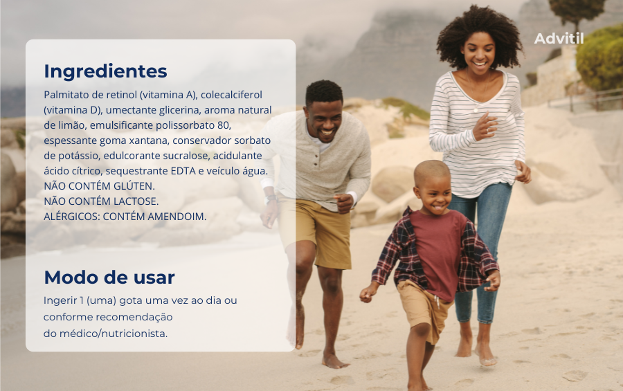 Advitil® é um suplemento para suprir as deficiências das vitaminas A e D. Vitaminas que auxiliam no funcionamento do sistema imunológico, na saúde da pele e da visão, além de outros benefícios como a absorção de cálcio e fósforo em nosso corpo, o que auxilia na formação de ossos e dentes em crianças e na manutenção da saúde óssea em adultos e idosos.
