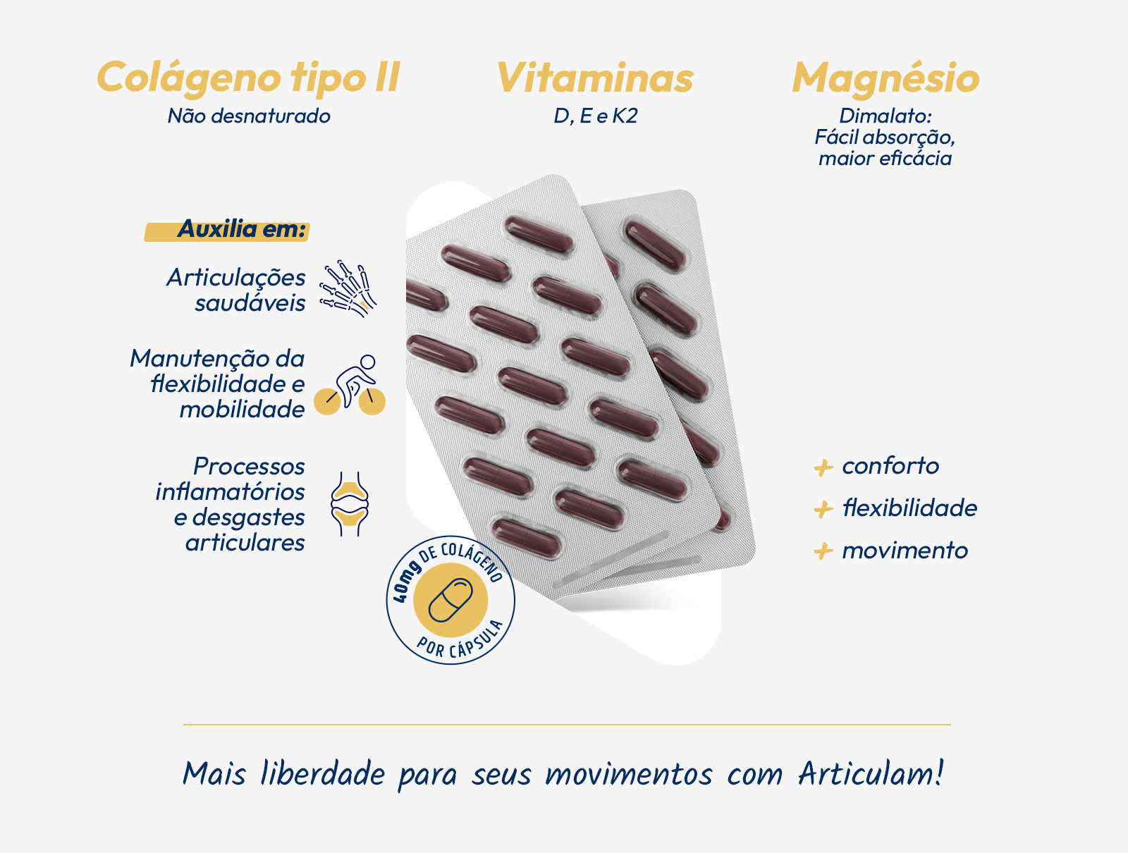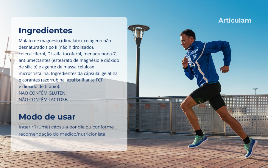 Suplemento alimentar com colágeno tipo 2 (não desnaturado) + vitaminas e magnésio. Auxilia no alívio da dor nas articulações e na manutenção das funções articulares. Articulam Ultra é uma forma eficaz e prática de cuidar das articulações.