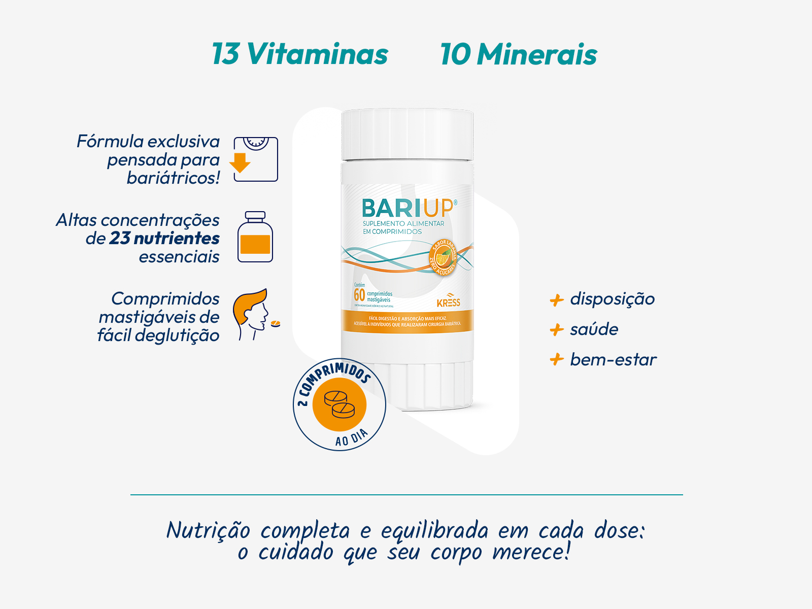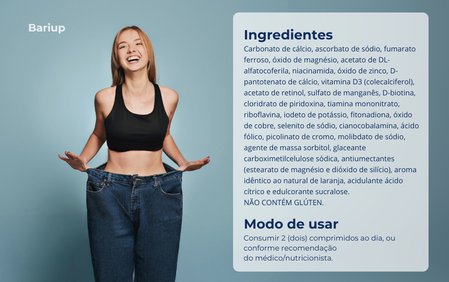 Bariup contém as vitaminas B12 (cianocobalamina), B9 (ácido fólico), B7 (biotina), A, D, K e os minerais cobre, ferro, selênio e zinco, além de vários outros nutrientes em doses adequadas para quem realizou cirurgia bariátrica. Por isso, Bariup é considerada a melhor vitamina pós-bariátrica, além de ser deliciosa e mastigável!