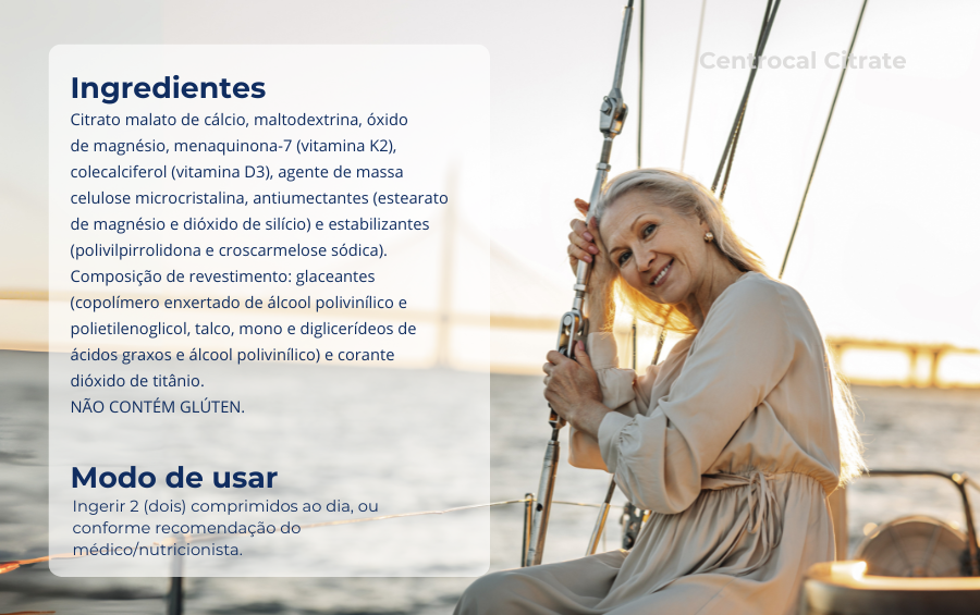 Suplemento mineral e vitamínico para saúde óssea, muscular e cardiovascular, contendo cálcio, magnésio, vitaminas D3 e K2 MK7. A fórmula favorece a absorção e a mineralização óssea, prevenindo a perda mineral e promovendo a saúde cardiovascular. Indicado para adultos, idosos, mulheres no climatério e pessoas com baixa ingestão de cálcio ou restrição ao consumo de laticínios.