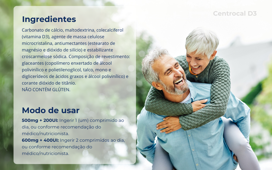 Suplemento alimentar a base de carbonato de cálcio, mais vitamina D3, que facilita a absorção do nutriente no intestino. O cálcio auxilia na formação e manutenção de ossos e dentes saudáveis, contribui no processo de contração muscular, na coagulação sanguínea e na saúde cardiovascular. A vitamina D3 também fortalece a imunidade e podecontribuir para o humor.