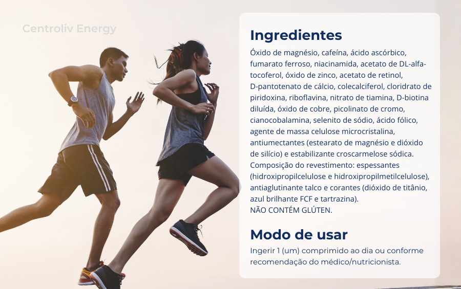 Centroliv® Energy é um polivitamínico de A a Z, especialmente desenvolvido para aumentar a energia e disposição. Mais que um suplemento para dar energia, Centroliv® Energy contém minerais e vitaminas para aumentar a imunidade e colabora com a manutenção da saúde e bem-estar.