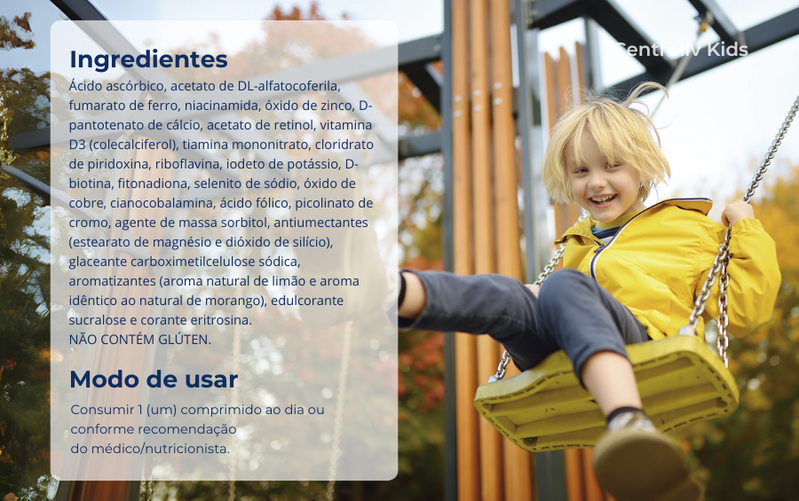 Suplemento de minerais e vitaminas para crianças. Sua fórmula contém 19 nutrientes essenciais para aumentar a imunidade, auxiliar no crescimento saudável e no desempenho físico e mental das crianças, além de vários outros benefícios. Você encontra Centroliv® Kids em saborosos comprimidos mastigáveis!