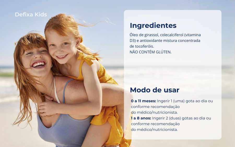 Defixa® Kids proporciona suporte para o desenvolvimento saudável durante a infância. Auxilia na formação e manutenção de ossos e dentes, fortalece o sistema imunológico e contribui para a adequada função muscular. É ideal para suprir as necessidades diárias das crianças e promover o bem-estar desde os primeiros anos de vida.