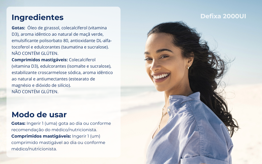 Suplemento de vitamina D3, disponível em gotas e comprimidos mastigáveis. A vitamina D é fundamental para a absorção adequada de cálcio e fósforo, que são essenciais para a formação e manutenção de ossos e dentes saudáveis. Também desempenha um papel importante no fortalecimento da imunidade, auxiliando no funcionamento