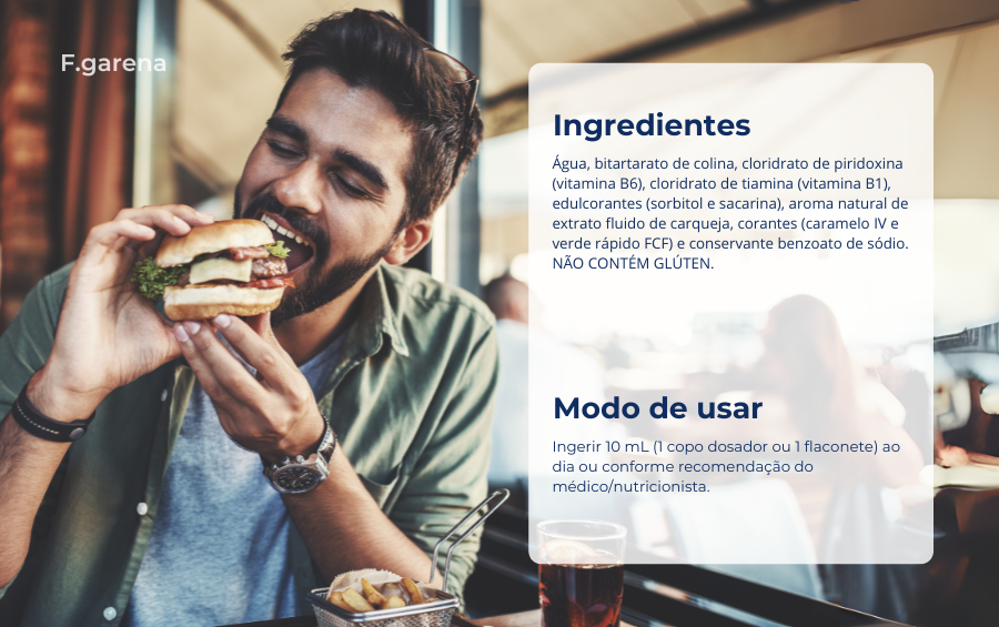 Suplemento de vitaminas do complexo B indicado para má digestão. F.Garena contém alto teor de colina (vitamina B8), vitamina B1 e B6, nutrientes que auxiliam no metabolismo energético e de proteínas, carboidratos e gorduras. A colina cumpre um papel importante no funcionamento hepático, auxiliando na remoção das gorduras para fora do fígado, que serão aproveitadas como fonte de energia.