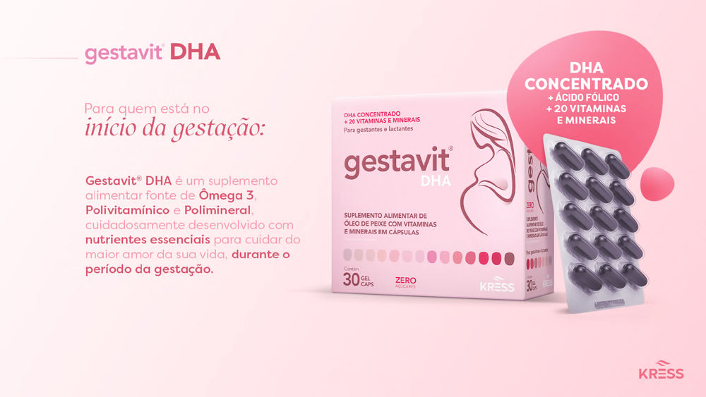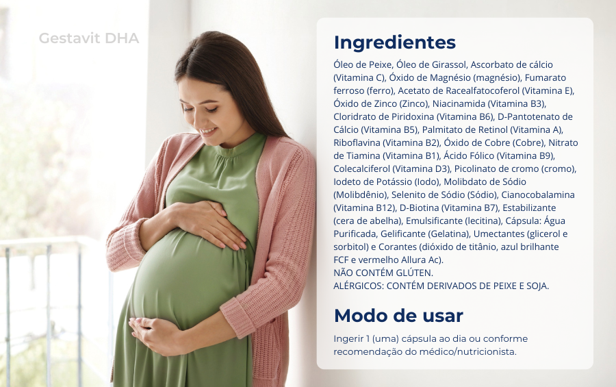 Gestavit® DHA é um suplemento alimentar fonte de ômega 3, essencial para o período da gestação. Sua fórmula contém DHA, EPA + 20 nutrientes essenciais, cuidadosamente escolhidos para auxiliar no desenvolvimento saudável do bebê. Também é indicado para a fase de de amamentação, auxiliando na qualidade do leite materno. O ômega 3 é importante para o desenvolvimento do cérebro e dos olhos do bebê durante a gestação e no período de amamentação.