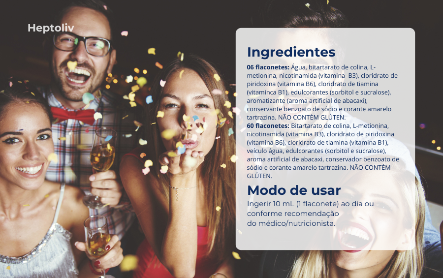 Suplemento com nutrientes essenciais para auxiliar na digestão e no mal-estar causados pelo exagero na ingestão de alimentos e bebidas. Contém alto teor de colina e alto teor das vitaminas B1, B3 e B6.