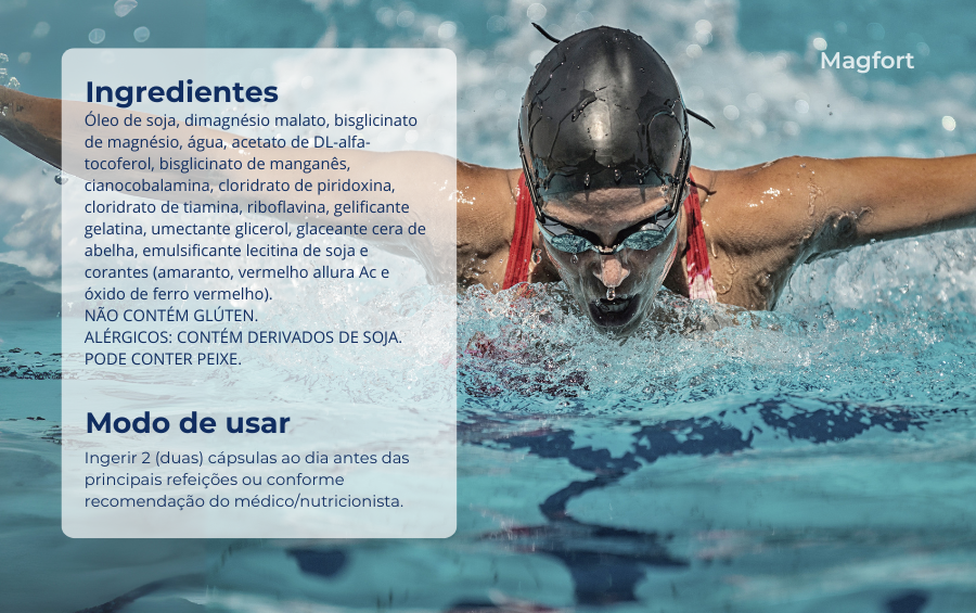 Suplemento vitamínico e mineral com dimagnésio malato, bisglicinato de magnésio, manganês e com alto teor de vitaminas E, B1, B2, B6, B12. Magfort® foi especialmente desenvolvido para manter o bom funcionamento muscular, auxiliar no alívio da dor pós-treino ou atividades físicas intensas, e auxiliando também no equilíbrio de eletrólitos, podendo atuar na prevenção de câimbras.