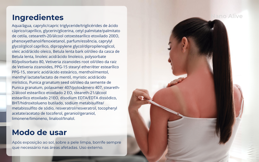 Sua fórmula possui ação refrescante, hidratante e emoliente, favorecendo a revitalização da pele. Nano Alive® contém ativos nanoencapsulados para hidratação intensa, além da camada superficial da pele. Mais do que uma loção pós-sol, ele atua como um hidratante intenso, promovendo a regeneração da pele. Por isso, quando precisar de uma ajudinha para revitalizar mãos e pés ressecados, conte com Nano Alive®