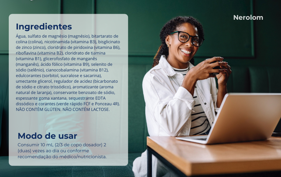 Suplemento indicado no combate às deficiências nutritivas de vitaminas e minerais. Contém excelentes doses das vitaminas do complexo B, magnésio, selênio, manganês, zinco e colina. Com Nerolom®, você ganha mais disposição para as atividades do dia a dia, além de ajudar na melhora da concentração, memória e regulação de neurotransmissores, o que te deixará mais de bem com a vida. Ideal para quem procura por minerais e vitaminas para o cansaço físico e mental