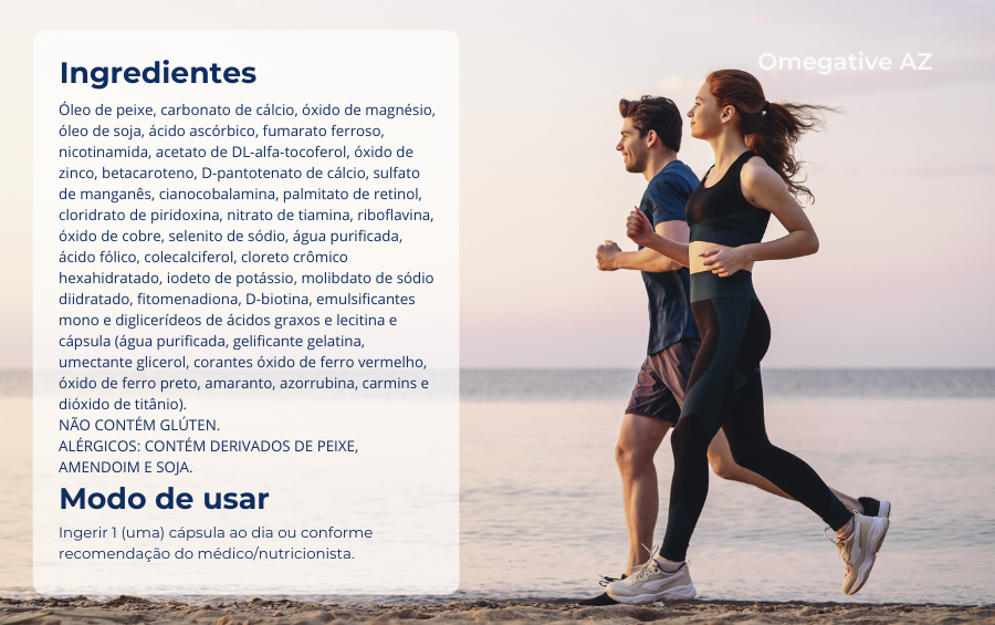 Suplemento para suprir deficiências de nutrientes de dietas inadequadas e outras condições biológicas. Omegative® Ômega AZ é um polivitamínico de A a Z com ômega 3. Sua fórmula foi pensada para auxiliar no aumento da imunidade, no bom funcionamento do cérebro, na diminuição de inflamações, na formação e coagulação do sangue e na saúde da pele, olhos, ossos e dentes. Possui também minerais e vitaminas antioxidantes que ajudam na proteção contra os radicais livres.