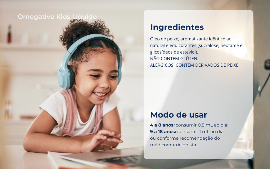 Crianças podem ter dificuldade em engolir comprimidos, por isso Omegative® ômega 3TG kids foi feito especialmente para elas. É uma excelente fonte de ômega 3, rica em ácidos graxos EPA e DHA na forma de triglicerídeos reesterificados (TG). Essa forma é facilmente reconhecida pelo organismo, garantindo maior biodisponibilidade,