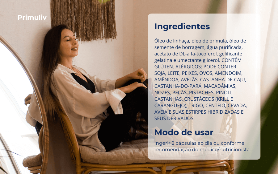 Primuliv é um suplemento natural para alívio dos sintomas da TPM e da menopausa com eficácia comprovada por estudos clínicos! Contém óleo de prímula, óleo de linhaça, óleo de borragem e vitamina E. Sua combinação de óleos possui ação anti-inflamatória e auxilia no equilíbrio hormonal promovendo alívio e bem-estar.