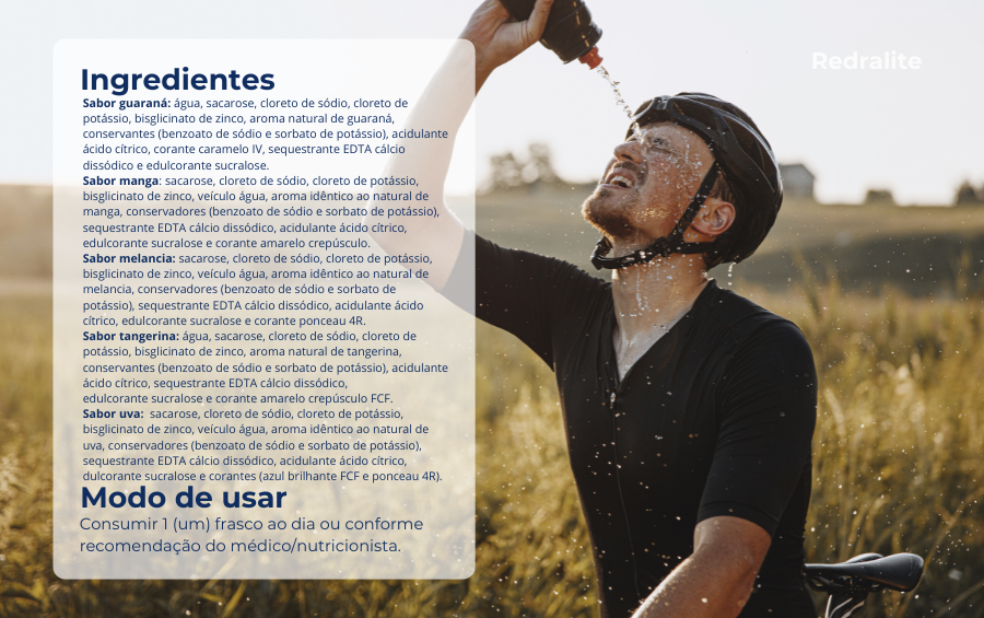 Suplemento alimentar desenvolvido para restaurar eletrólitos perdidos durante a desidratação do corpo. Redralite® contém sódio, potássio, zinco e carboidratos para auxiliar na manutenção do equilíbrio de fluídos e eletrólitos no organismo, além de ajudar no fortalecimento da imunidade. Ideal para beber durante ou após a prática de exercícios físicos.