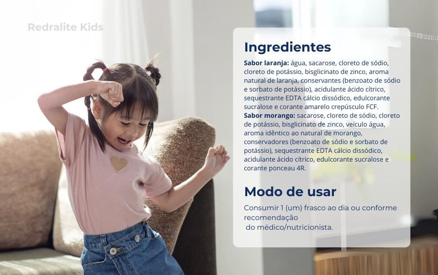 Suplemento alimentar desenvolvido para restaurar eletrólitos perdidos durante a desidratação do corpo. Redralite® Kids contém sódio, potássio, zinco e carboidratos para auxiliar na manutenção do equilíbrio de fluidos e eletrólitos no organismo, além de ajudar no fortalecimento da imunidade. Ideal para beber durante ou após a prática de exercícios físicos.