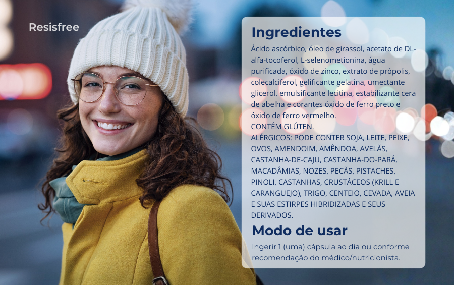 Resisfree® combina extrato de própolis, vitaminas C, D e E, além de selênio e zinco, nutrientes essenciais que atuam na proteção das células contra os radicais livres e no reforço das defesas naturais do organismo. Sua fórmula auxilia na recuperação do corpo, contribui para o bem-estar geral e oferece suporte diário contra agentes externos, inflamações e dores de garganta.