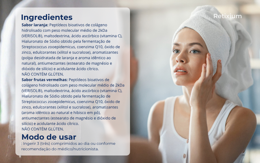 Retixium® é um suplemento premium com Colágeno Verisol®, Ácido Hialurônico, Coenzima Q10 e mais 8 nutrientes, desenvolvido para auxiliar na prevenção do envelhecimento da pele. Sua fórmula exclusiva possui potente ação antioxidante, combatendo radicais livres e estimulando a produção natural de colágeno para uma pele mais jovem e saudável.