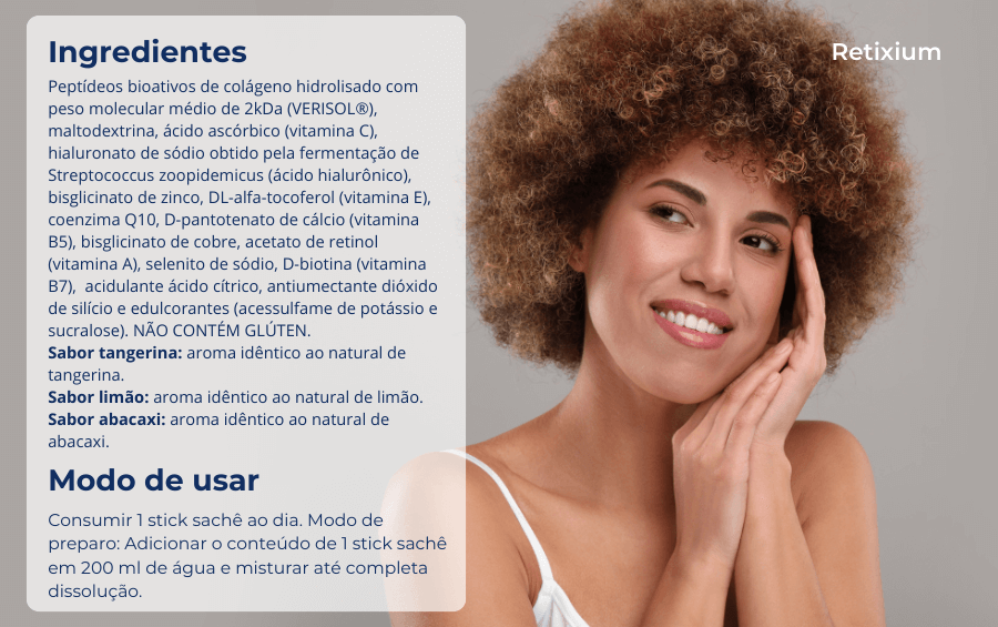 Suplemento premium com Colágeno Verisol, Ácido Hialurônico, Coenzima Q10 e mais 8 nutrientes, desenvolvido para auxiliar na prevenção do envelhecimento da pele. Sua fórmula exclusiva possui potente ação antioxidante, combatendo radicais livres e estimulando a produção natural de colágeno para uma pele mais jovem e saudável.