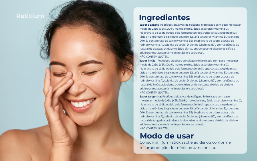 Retixium® é um suplemento premium com Colágeno Verisol®, Ácido Hialurônico, Coenzima Q10 e mais 8 nutrientes, desenvolvido para auxiliar na prevenção do envelhecimento da pele. Sua fórmula exclusiva possui potente ação antioxidante, combatendo radicais livres e estimulando a produção natural de colágeno para uma pele mais jovem e saudável.