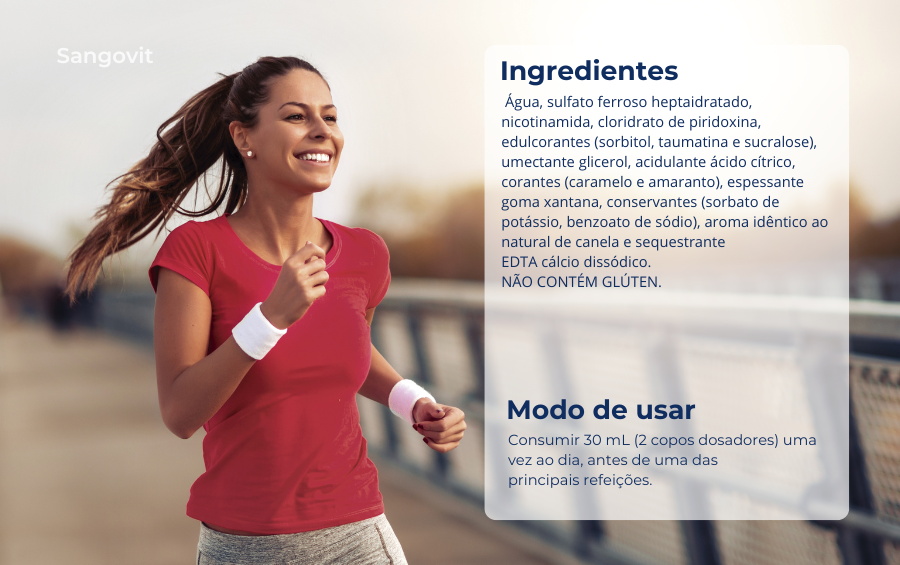 Sangovit® atua na prevenção dos estados de deficiência de ferro em geral e na prevenção do cansaço físico e mental. Suplemento a base de ferro, enriquecido com as vitaminas B6 e B3. Atua na prevenção da anemia ocasionada por falta de ferro e alivia os seus sintomas, como sonolência, cansaço, perda de apetite e queda de cabelo.
