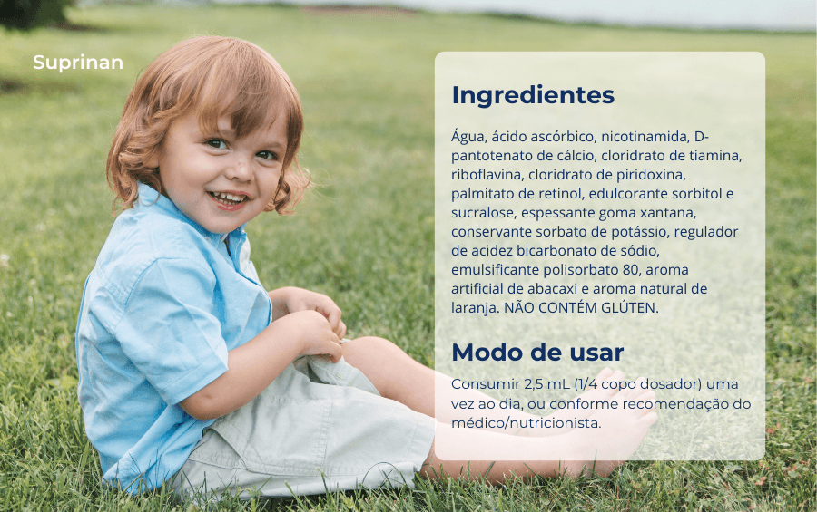 Indicado na prevenção de deficiências vitamínicas em casos de pouco apetite ou maus hábitos alimentares. Suplemento de vitaminas para crianças, a partir de 4 anos. Contém nutrientes essenciais para auxiliar a aumentar a imunidade e o crescimento saudável das crianças. Sua fórmula contém vitamina A, vitaminas do complexo B e vitamina C. Com agradável sabor de frutas tropicais, aprovadíssimo pelas crianças!