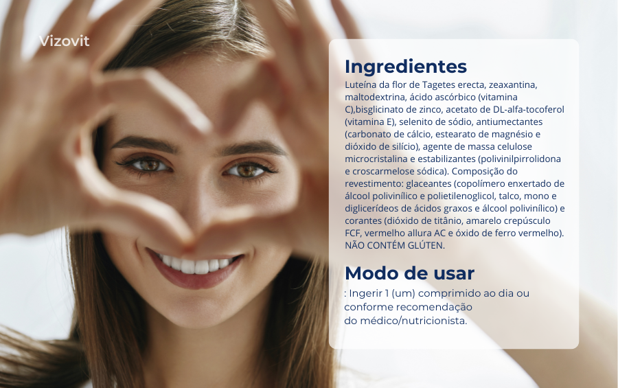 Suplemento de luteína e zeaxantina com vitaminas e minerais. A luteína e a zeaxantina são os dois carotenoides antioxidantes que atuam especialmente na saúde da visão. Vizovit® pode ser considerada a melhor vitamina para os olhos por ter ótimas doses de carotenoides, com luteína 20 mg e zeaxantina 3 mg, além de ser enriquecido com vitamina C, vitamina E, selênio e zinco, nutrientes essenciais para a manutenção da saúde dos olhos.